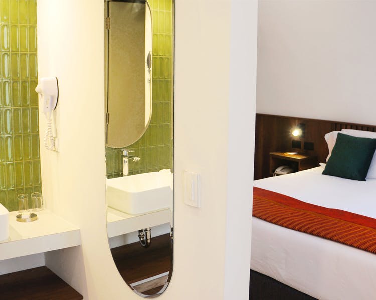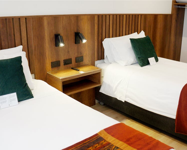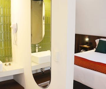 Two (02) connected rooms with capacity up to four (04) people. Two (02) Smart TVs, heating system and 1 full bathroom with shower & amenities + 1 room lavatory with mirror. Access to common areas with hot and cold drinks 24h.